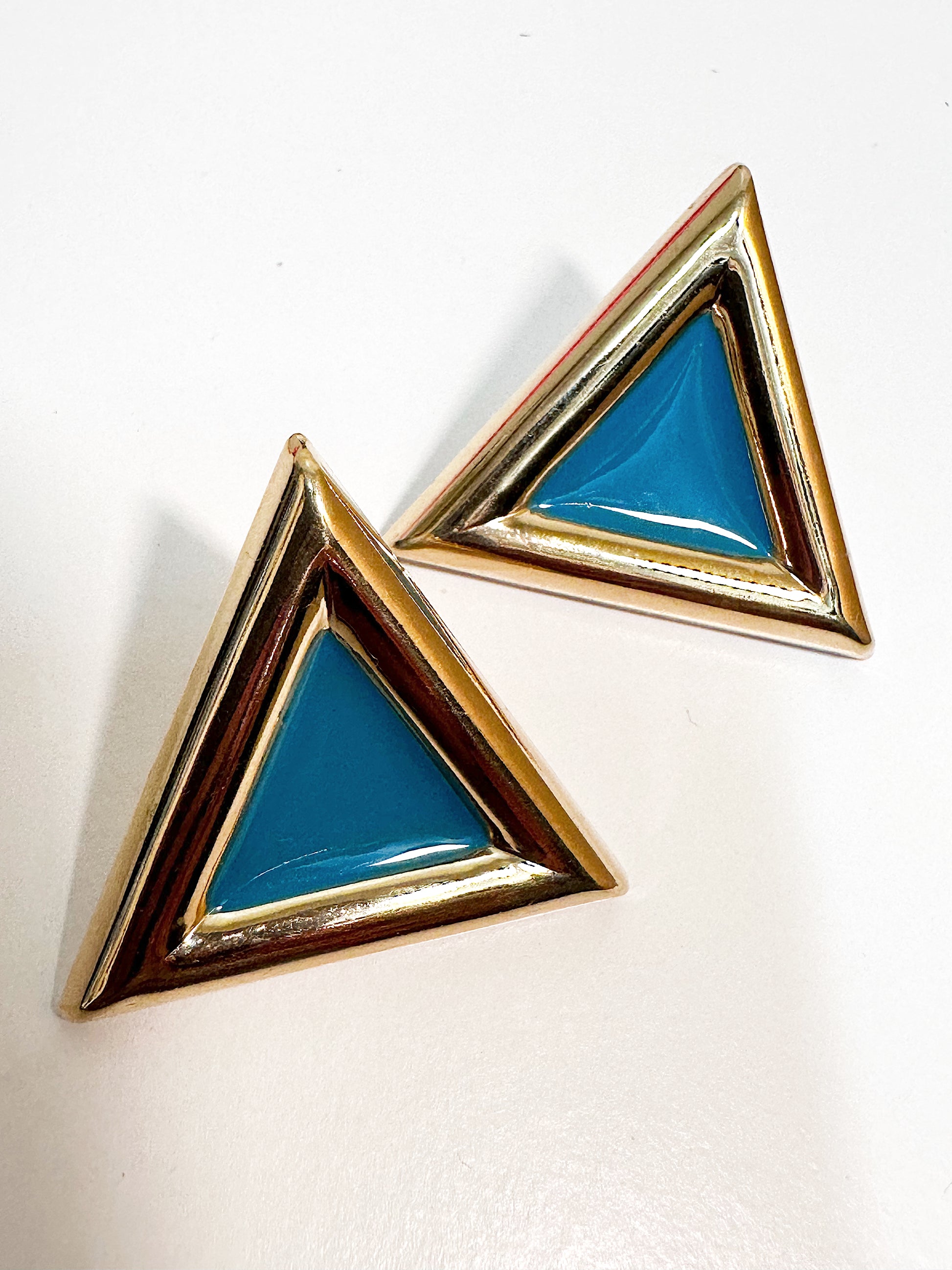 Turquoise enamel gold tone triangular stud earrings for pierced ears.